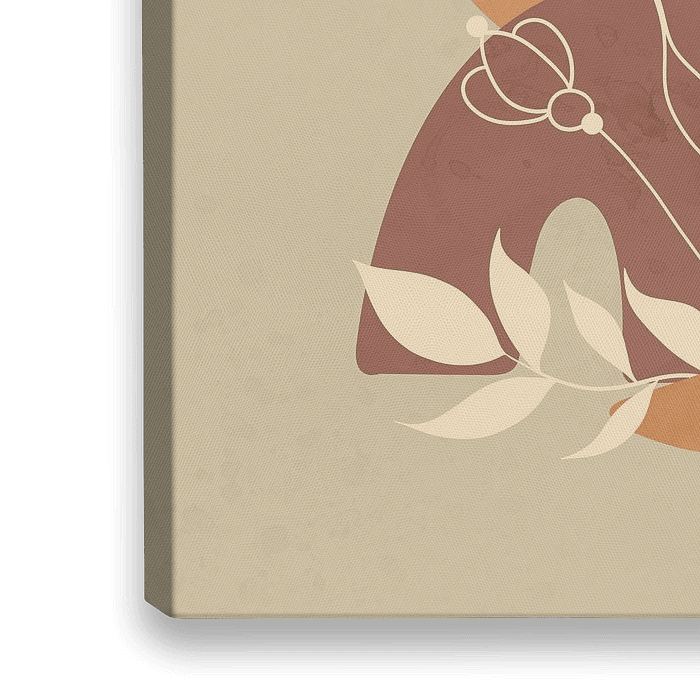 Moderne minimalistische illustratie van een bloem, een takje met bladeren en verschillende organische vormen in lichte aardetinten: terracotta rood, sienna en beige.