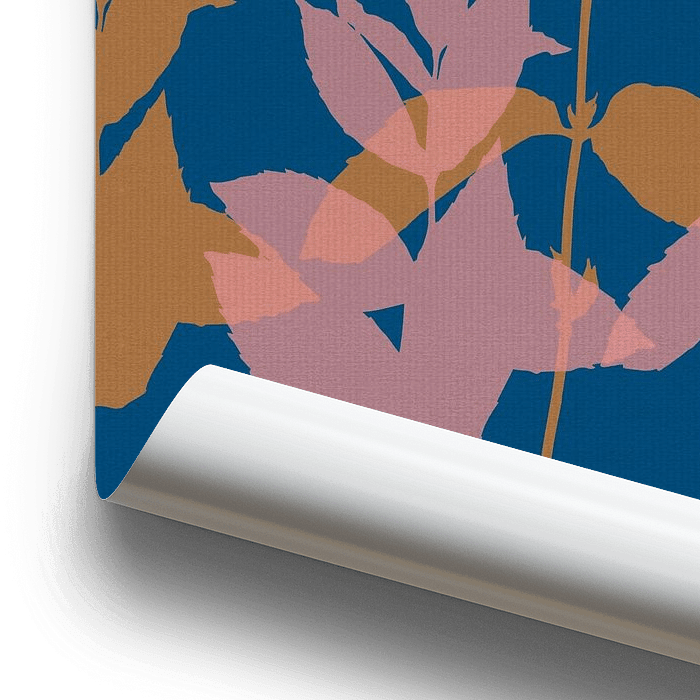 Koop dit abstracte kunstwerk Moderne minimalistische botanische kunst. Oker en roze bladeren op blauw van Abstract Minimalist Art als print op canvas, aluminium dibond, (ingelijste) fotoprint, behang en ArtFrame. Voor jou op maat geprint in Fine-Art kwaliteit.