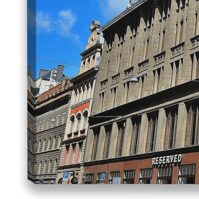 Deze foto van een monumentaal, historisch pand, gelegen aan Kaļķu Street, 15 - Riga, Letland, is op 21 juli 2015 gefotografeerd. Het (bank)gebouw is ontworpen door de beroemde letse architect Jānis Alksnis (1869 – 1939).