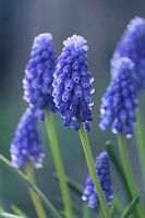 De tere blauwe bloemen van Muscari armeniacum (Druifhyacint), buiten bloeiend in het voorjaar, tegenlicht door het blauwe avondlicht. Delicate bloemen fotografie.