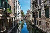 Heerlijk romantisch doorkijkje in het wonderschone Venetie, Italie. Met wat bootjes en oude gebouwen aan weerzijden van heet blauwe water.