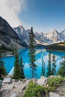 Foto van Moraine Lake in Banff National Park, Alberta, Canada. Van alle prachtige meren in dit park, vond ik dit toch wel de mooiste. Het water is knalblauw. Hoewel het hier enorm toeristisch was, lukte het toch om wat foto's te nemen waar geen mensen op stonden. Er zullen nog veel meer foto's van dit prachtige meer in mijn webshop…