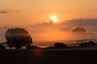 Sunrise above wet meadows and lines of trees and bushes, rural countryside, sun shining on morning mist, morning mood full of atmosphere.