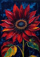 De Moulin Rouge zonnebloem is gedurfd en intens weergegeven in acryl tegen een diepe nachtelijke hemel. De fluweelachtige karmozijnrode bloemblaadjes en het donkere hart creëren een gevoel van drama, versterkt door rijke texturen en contrast. De bloem straalt vurige elegantie uit, steekt fel af tegen de duisternis en symboliseert kracht…