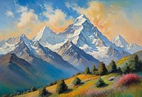 De Mount Everest rijst de hemel in met zijn besneeuwde top in de lucht. Impressionistische streken van ijsblauw, zacht lavendel en bleek goud roepen zijn afgelegen majesteit op, terwijl drijvende wolken rond zijn massieve bergkammen dwarrelen. De berg lijkt zowel onbereikbaar als eeuwig, een embleem van menselijke aspiratie en de…