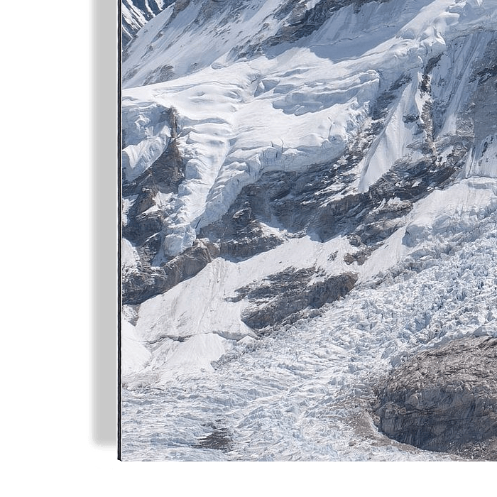 De top van de Mount Everest, met 8848 meter de hoogste berg ter wereld. Deze reus ligt in de Himalaya op de grens van Nepal en Tibet. De foto is genomen vanuit de Nepalese Khumbu vallei. Op de voorgrond steile gletsjers, ijsstromen.