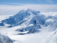 De gigantische ijsmassa van de berg Mount Foraker, gezien vanaf de Denali. Deze toppen liggen in Denali National Park in Alaska en zijn geliefd bij expeditie klimmers van over de hele wereld.