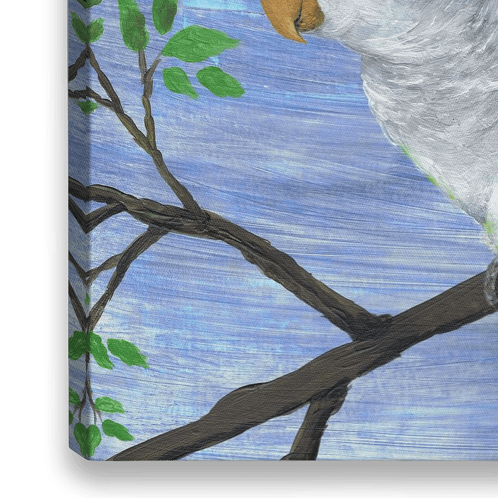 Acryl schilderij van een groene muisparkiet of een monniksparkiet. Hij zit in een boom met groene bladeren. Achter hem een blauwe lucht.
