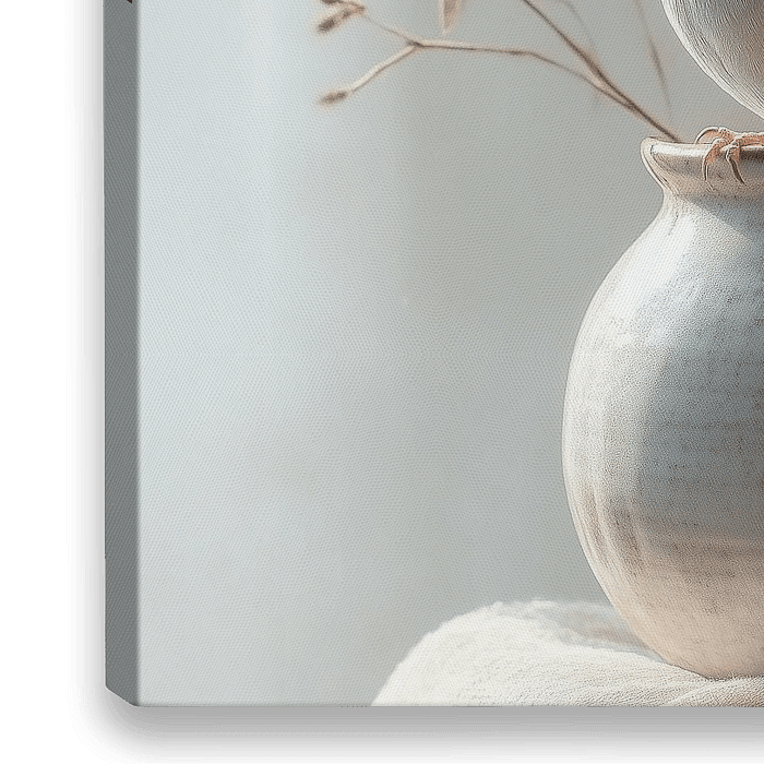 Op een zacht textiel doek, waarvan de fijne plooien en subtiele structuur het licht op een delicate manier vangen, staat een witte vaas. Het doek is in lichte, neutrale tinten gehouden, een mix van ivoor en beige, die een serene en rustige achtergrond vormt. De vaas zelf is glanzend wit, met een glimp van reflectie die het zachte…