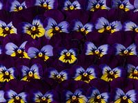 "Muurbloempjes" een muur vol viooltjes uit de tuin (paars / geel / blauw)", is foto van viooltjes uit de tuin geplukt en over elkaar gelegd om er een geheel van te maken met een viooltje er bovenop. Maar door het ritme en herhaling valt dit viooltje amper op en gaat het op in het geheel. (camouflage)