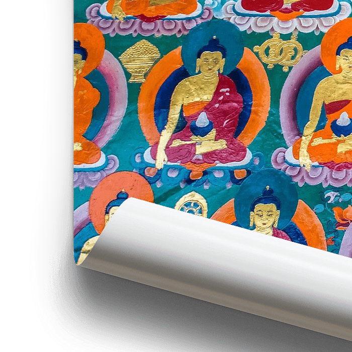 Koop de foto Muurschildering met boeddha's in Tibetaans klooster van Rietje Bulthuis op canvas, aluminium dibond, (ingelijste) fotoprint, behang en ArtFrame, op maat geprint in Fine-Art kwaliteit.