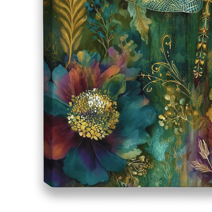 Laat je betoveren door de magische wereld van natuur en kleur in “Mystieke”. Dit schilderij brengt de elegante schoonheid van een libelle tot leven, omringd door weelderige bloemen in diepe tinten van goud, smaragd, paars en turquoise.