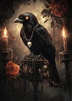 Een imposante zwarte raaf troont op een sierlijk versierde, verweerde kandelaar. Zijn ogen gloeien onheilspellend rood en om zijn nek hangt een zware ketting met een kleine doodshoofdhanger. Brandende kaarsen baden het tafereel in flikkerend licht, terwijl gesmolten was langs de houders naar beneden druipt. Omringd door verwelkende en…