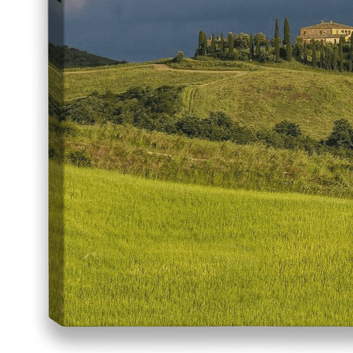 Je ziet hier een mooi uitkijkje op een typisch stukje idyllisch Toscaans landschap. Op de heuvel ligt een boerderij of agriturismo en om het gebouw heen een aantal cipressen . Er zijn donkere wolken die regen lijken te gaan brengen, maar de boerderij baadt nog steeds in het late namiddag zonlicht.