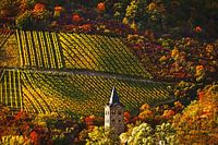 Blik op de Duitse Rijnoever nabij Sankt Goar vlak voor de druivenoogst