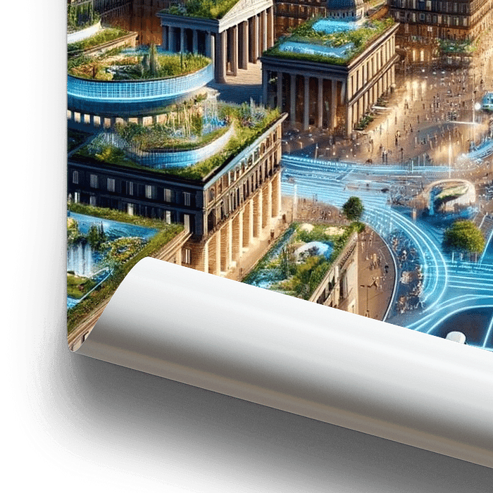 Deze indrukwekkende poster toont een futuristisch beeld van de Italiaanse stad Napels, dat meteen in het oog springt met zijn levendige kleuren en moderne elementen. Op de voorgrond strekt de kustlijn zich uit, omzoomd met elegante gebouwen en weelderig groene dakterrassen. De straten zijn bezaaid met moderne, zelfrijdende voertuigen en…