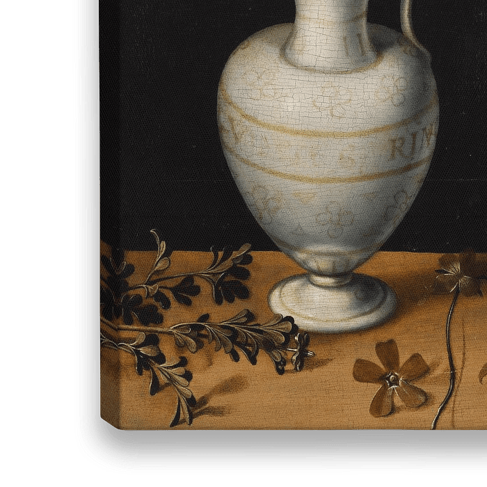 In een hoge schenkkan staat een tuiltje bloemen met narcissen, viooltjes en maagdenpalm. Op tafel liggen nog wat losse bloemen en een takje wijnruit. Oorspronkelijk was de maagdenpalm blauwpaars, maar het blauwe pigment verloor in de loop der eeuwen zijn kleur. Daardoor zien we nu de oranjebruine onderlaag.