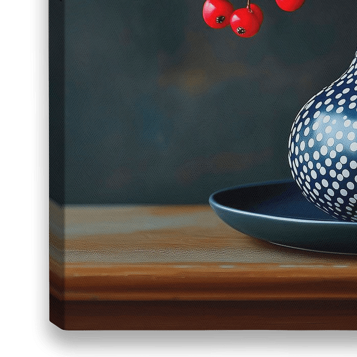 Een stilleven van een keramische vaas met een wit stippenpatroon gevuld met rode meidoornbessen tegen een donkere achtergrond met een sfeervol zacht licht.
