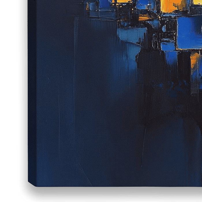 Neon Echoes - Dit abstracte schilderij kenmerkt zich door een dominante aanwezigheid van diepblauwe en felgele kleuren die met krachtige, verticale en horizontale streken zijn aangebracht en samensmelten tot een dynamisch stedelijk beeld.