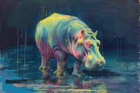 Neon Titan Wading - Abstract schilderij neon nijlpaard