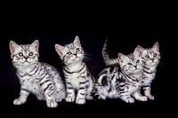 Groep jonge zwart zilver tabby katten geïsoleerd op zwarte achtergrond. We fokken zelf deze Britse kortharige kittens. Daarom kan ik mooie studiofoto's maken van deze bijzondere huisdieren. Het beeld is bijna een zwart-wit beeld, behalve de kleur in de oren en ogen.