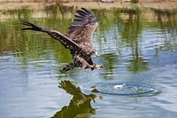 Europese zeearend maakt zich op voor de landing op een visje, klauwen vooruit