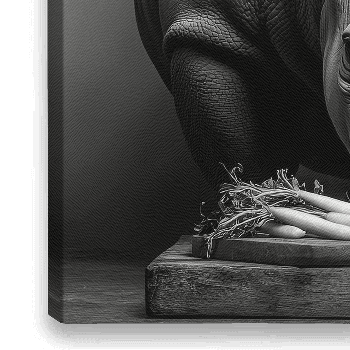Het wilde karakter van een neushoorn en de rust van een moderne keukenscène komen samen in een fascinerend moment. Het scherpe contrast tussen het majestueuze dier en de eenvoudige kookpot creëert een onverwachte spanning. Dit kunstwerk is een spannende toevoeging aan de keuken die zowel een gesprek stimuleert als de aandacht trekt.