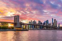 Skyline New York met de Brooklyn bridge over de East River op de voorgrond tijdens een mooie zonsondergang. Zicht vanaf Pebble beach.