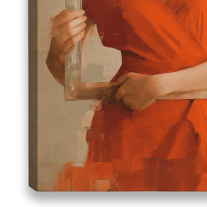 Een kunstwerk van een vrouw in een rode jurk die sierlijk poseert met een rechthoekige schilderijlijst. Haar haar is in zachte golven gestyled en ze kijkt zelfverzekerd opzij. De achtergrond bestaat uit een neutrale structuur die contrasteert met haar outfit en de algehele artistieke sfeer van de afbeelding versterk.