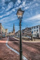 Stadsbeeld van de Friese hoofdstad Leeuwarden, met zicht op de Bonifatius kerktoren vanaf de Nieuweburen genomen met lantaarnpaal op de voorgrond.