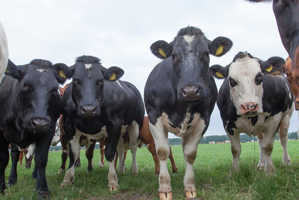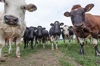 Een kudde koeien kijkt nieuwsgierig in de lens van de fotograaf.