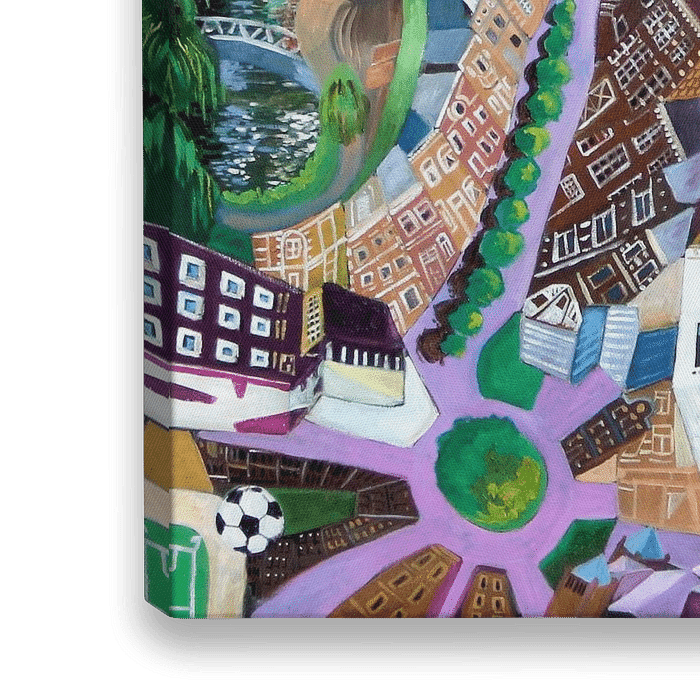 Op het schilderij zie de kenmerkende gebouwen van Nijmegen; Sint Stevenskerk, Waaggebouw, Belvédère en het Kronenburgerpark met de Kruittoren. Het Valkhof en de Sint-Nicolaaskapel, Doornroosje poppodium, concertgebouw de Vereeniging en natuurlijk het belangrijkste event van het jaar de 4-daagse. Met "The Walk the World" trekt het 47.000 enthousiaste wandelaars aan en zet het de stad een hele week in feestgedruis met duizenden bezoekers.