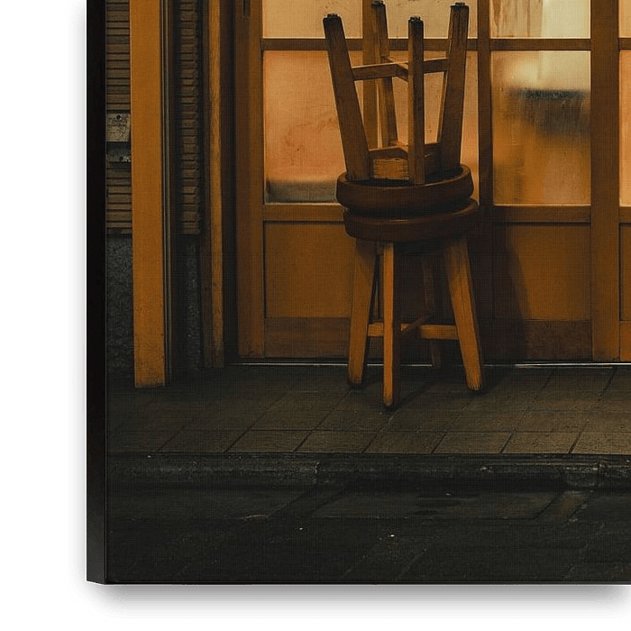 Deze foto vangt de gezellige sfeer van een traditioneel Japans restaurant, waarvan de lichtbruine houten gevel en grote schuifdeuren doen denken aan de warme gastvrijheid van Nippon. Een handgeschreven menu op het schoolbord en gestapelde stoelen op de voorgrond versterken de authenticiteit van het stedelijke nachtleven dat…
