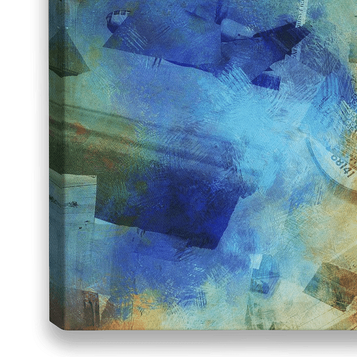 Wat begon als een foto van gekleurde patina op een metalen oppervlak werd in vele digitale stappen getransformeerd tot een levendige collage van verschillende beeld- en tekstoverlays, wat resulteerde in een gestructureerd, abstract werk met dominante blauw- en aardetinten. Willekeurige elementen zoals fotofragmenten, gedrukte woorden en…