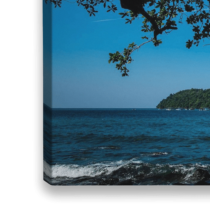 Een mooi uitzicht van een tropisch tafereel. De groene vegetatie op de voorgrond geven een sierlijke omlijsting aan dit beeld. Je wordt als het ware naar binnen gezogen. Direct gaat je oog naar het kleine iddylische tropische eilandje aan de horizon. Je zou bijna de oceaan willen overzwemmen om naar het eiland toe te gaan. Het blauwe water, de blauwe lucht geven een zomerse sfeer aan deze foto. De palmboom steekt mooi uit en vangt hee mooi het felle zonlincht. Dit is gefotografeerd in Sumatra op het eiland Pulau Weh in Azie.