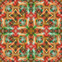 Een caleidoscopisch, geometrisch werk in herfstkleuren variërend van groen via geel en oranje naar rood en bruin, gebaseerd op een foto van een verkleurend eikenblad in oktober