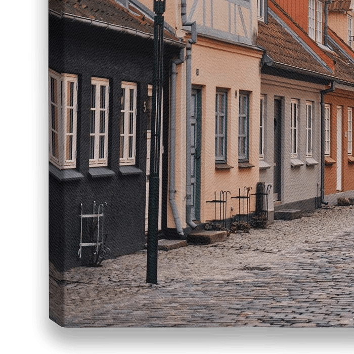 Foto van een straatje in het oude stadscentrum van Odense, Denemarken.