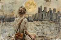 Olieverf schilderij van een jonge vrouw aan het water. Ze geniet van de grote volle maan, met het uitzicht van de stad op de achtergrond. Het schilderij heeft een dromerige en nostalgische sfeer, met een mix van realistische en abstracte elementen.