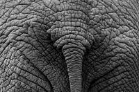 Grijs, rimpelig en groot. Het imposante achterwerk van een Afrikaanse olifant. Heeft in zwart wit een heel krachtig motief! Heel stoer voor als aluminium print wat mij betreft!