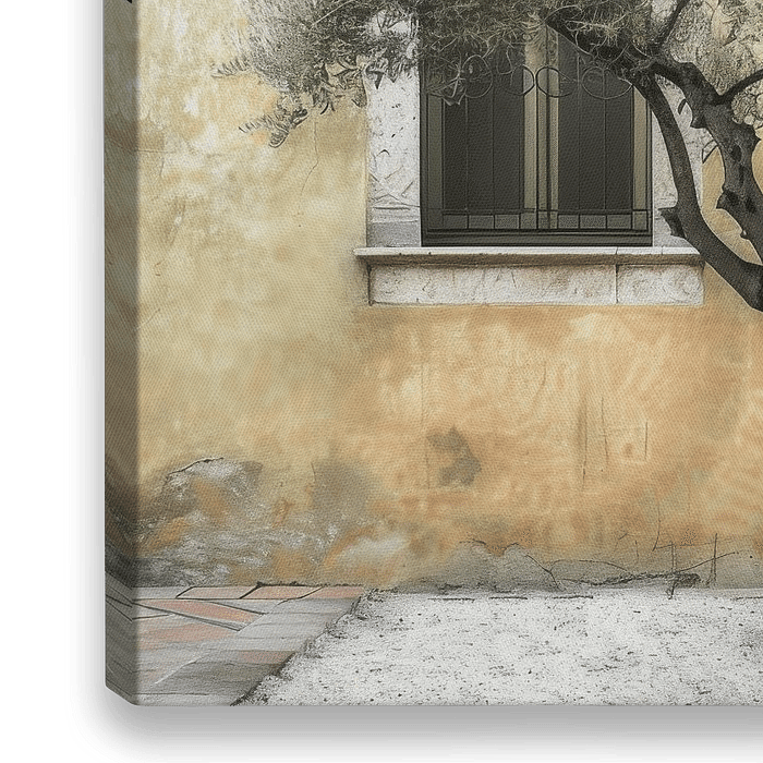 Deze sfeervolle foto toont een majestueuze olijfboom voor een oude, verweerde gevel. De architecturale details van het raam, gecombineerd met de natuurlijke charme van de boom, creëren een harmonieus evenwicht tussen de natuur en de bebouwde omgeving. Dit kunstwerk is perfect voor liefhebbers van mediterrane landschappen en klassieke…