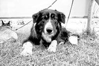 de hond kijkt naar de fotograaf, de andere hond let op de voetbalwedstrijd