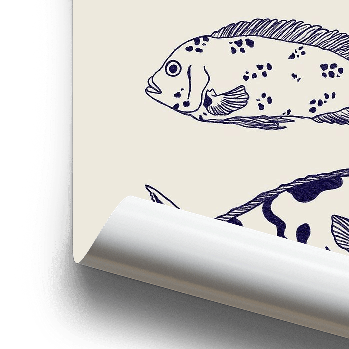 Deze handgetekende illustratie van vier unieke vissoorten brengt een gevoel van rust en verfijning naar elk interieur. De gedetailleerde lijntekeningen in een diepe indigotint tegen een zachte, neutrale achtergrond benadrukken de schoonheid van de onderwaterwereld. Perfect voor liefhebbers van maritieme kunst of minimalistische decoraties. Dit ontwerp combineert eenvoud en complexiteit en is een subtiele eyecatcher voor elke ruimte, van een moderne woonkamer tot een sfeervolle strandwoning. Laat je inspireren door de tijdloze charme van de oceaan en de prachtige patronen van zijn bewoners.