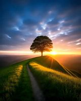 Het idyllische landelijke landschap ontvouwt zich op een zacht glooiende heuvel, waar een enkele boom majestueus in de ochtendzon staat. De boom met zijn uitgestrekte kruin is een symbool van rust, zijn takken wiegen zachtjes in de lichte ochtendbries. De weide, bedekt met een subtiel laagje verse dauw, glinstert in het warme gouden…