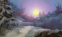 Het pad is nog niet betreden als de zon opkomt op deze wintermorgen. Het is ijzig koud, maar het sneeuwdek beschermt het bijna stilstaande leven onder zich. Zelfs de lucht lijkt bevroren.