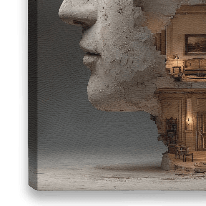 Een surrealistisch kunstwerk van een menselijk gezicht, onthult een interieur dat doet denken aan een knus huis. Het hoofd bestaat uit meerdere verdiepingen vol warm verlichte kamers, versierd met klassieke meubels en schilderijen. Trappen verbinden de verschillende ruimtes en vermengen de concepten van geest en architectuur in een…