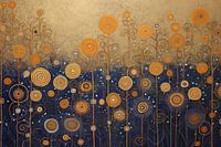 Dit werk toont een levendige verzameling van oranje bloemen tegen een diepe blauwe achtergrond. De bloemen hebben verschillende vormen en groottes, waardoor er een dynamische en speelse compositie ontstaat. De achtergrond is bezaaid met kleine stippen die lijken op sterren, wat een dromerige sfeer toevoegt aan het geheel.