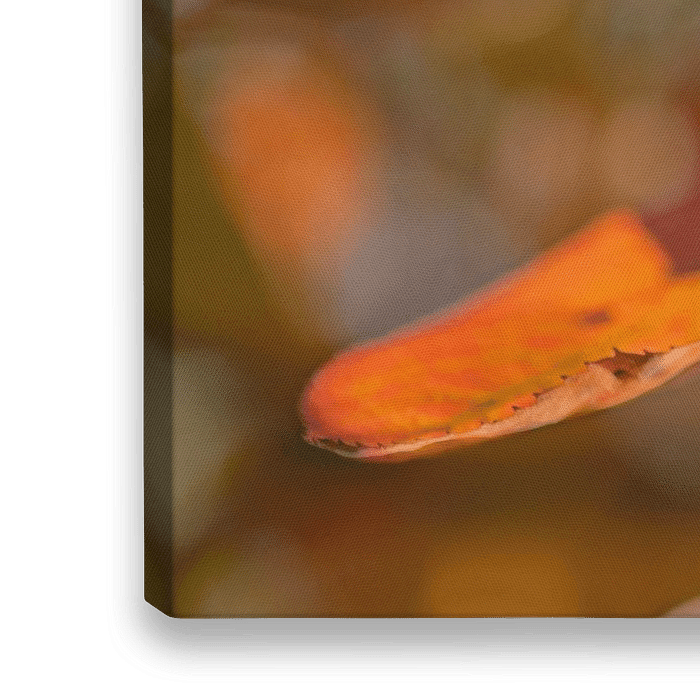 Prachtig gekleurde bladeren van het krentenboompje in mijn tuin. Door de geringe scherptediepte is maar een klein gedeelte van de foto scherp en lopen de warme kleuren van de achtergrond in elkaar over.