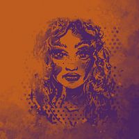 Dit kunstwerk is gemaakt als duotone print. Het werk is uitgevoerd in oranje tint in combinatie met paars. Op dit kunstwerk zie je een prachtige dame met krullend haar . Bestel deze wanddecoratie en geef je muur karakter.