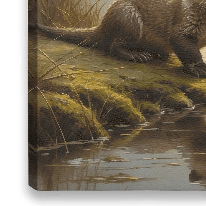 Dit werk toont een jonge otter aan de rand van het water, in het zachte licht van de vroege ochtend. De omgeving is stil en mistig; het water weerspiegelt het eerste zonlicht terwijl de dag zich voorzichtig aandient. Alles in dit beeld ademt nieuwsgierigheid, kwetsbaarheid en begin.