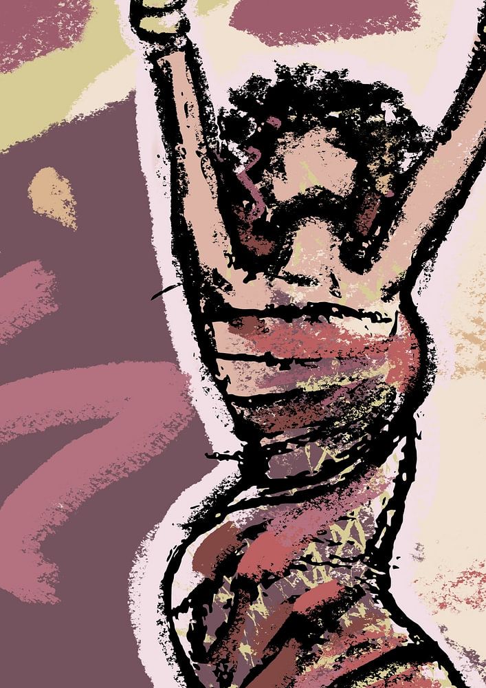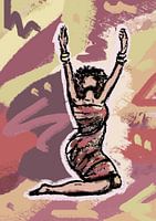 Kleurig impressionistisch kunstwerk. Een vrouw zit op haar knieën en heft haar handen in de lucht. Kunstwerk in warm beige, geel, oranje en roze. Dit werk heeft een impressionistisch en abstract karakter. De vrouw is met houtskool op papier getekend. De houtskooltekening is ingekleurd met verschillende digitale kwasten in photoshop.